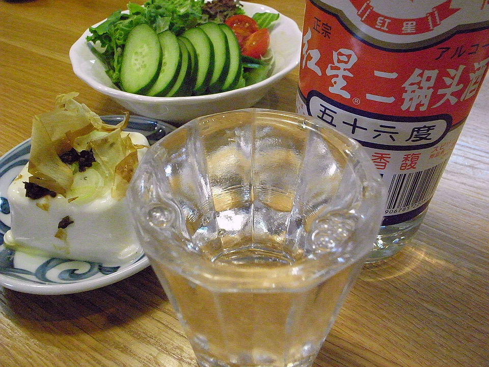 晩飯 キャベツとベーコンの味噌汁、「しその実のたまり漬」を薬味にした冷や奴、茄子の味噌炒り、プリックナムプラーと謎の調味料で食べる2種の焼売、トマトと胡瓜とレタスのサラダ、「紅星」の「二鍋頭酒」(生)、樹上完熟により市場には出まわらない「秋沢農園」の梨