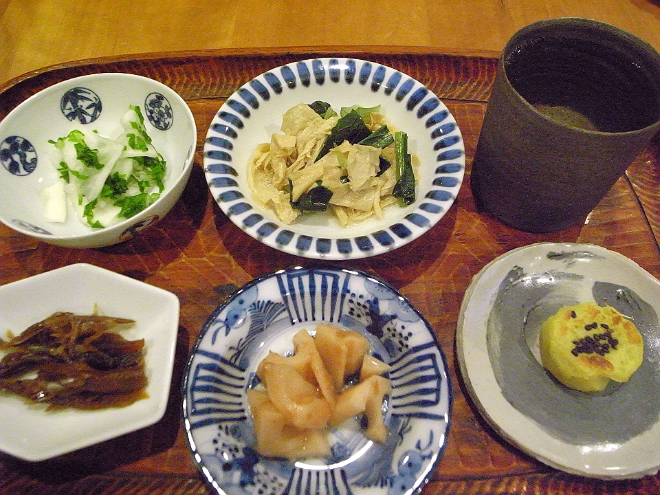 朝飯 揚げ湯波と小松菜の炊き合わせ、めかぶの酢の物、茄子の炒りつけ、菠薐草と榎茸のおひたし、大根と人参のぬか漬け、ごぼうのたまり漬、メシ、椎茸とブナシメジと菠薐草の味噌汁