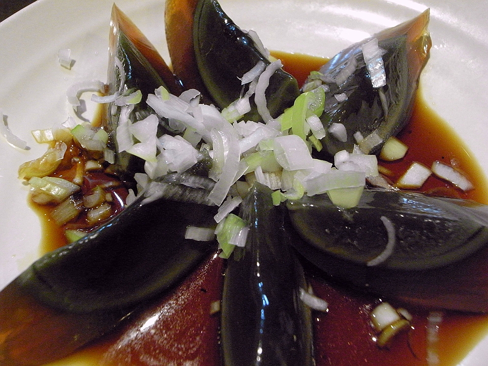 晩飯 「食堂ニジコ」のお通しの胡瓜と蕪の浅漬け、ピータン、あんかけ焼きそば、麦焼酎「二階堂」(お湯割り)、家に帰ってからのエクレア、Old Parr(生)
