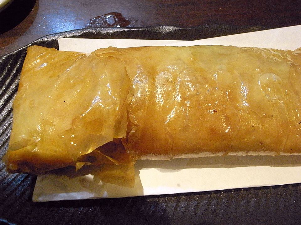 晩飯 「ユタの店」の皮蛋、2種の焼き餃子、炒飯、ハムとチーズと菠薐草の春巻き、焼酎「鏡月」(オンザロックス)