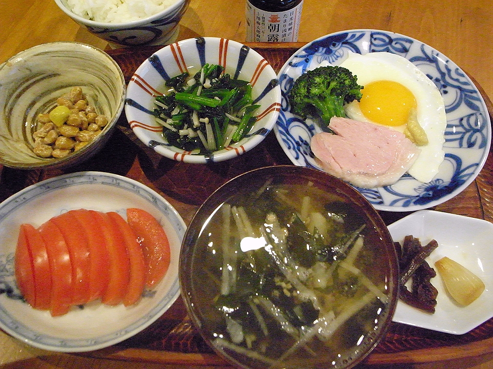 朝飯 生のトマト、納豆、榎茸と菠薐草のおひたし、ブロッコリーのソテーを添えたハムエッグ、らっきょうのたまり漬「小つぶちゃん」、たまり漬「七種きざみあわせ・だんらん」、メシ、若布と大根の味噌汁
