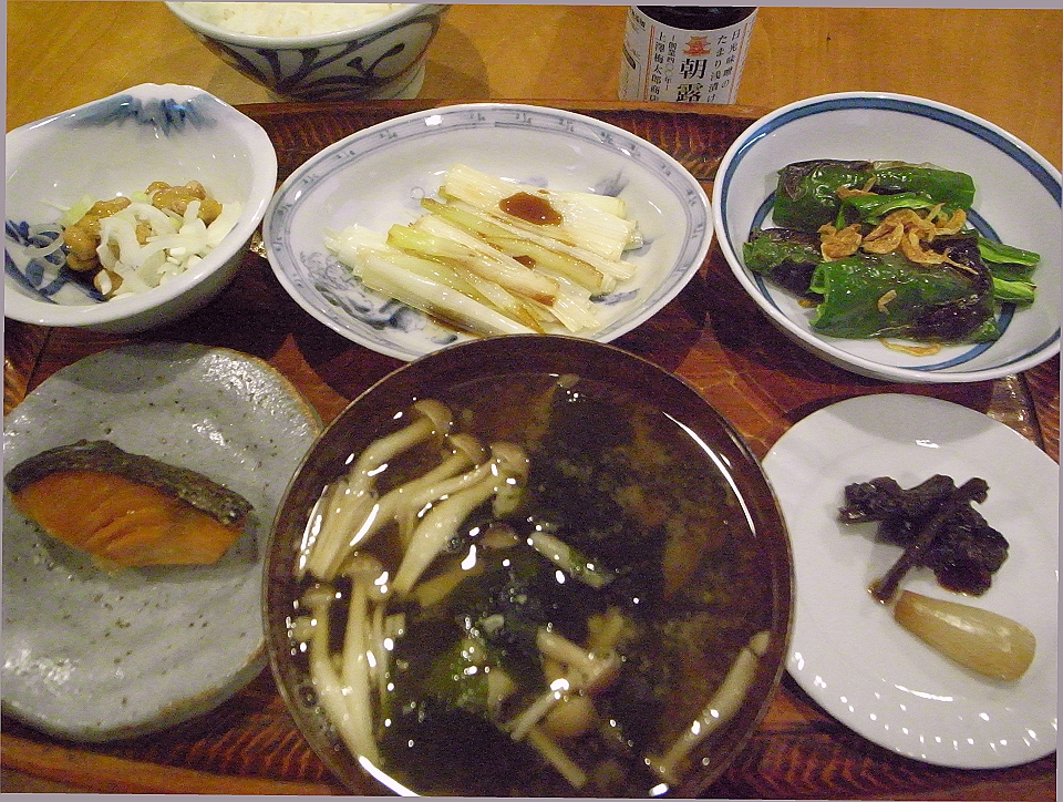 朝飯 焼き鮭、納豆、焼き葱の「朝露」がけ、ピーマンの網焼き、らっきょうのたまり漬「小つぶちゃん」、たまり漬「七種きざみあわせ・だんらん」、メシ、シメジと若布の味噌汁
