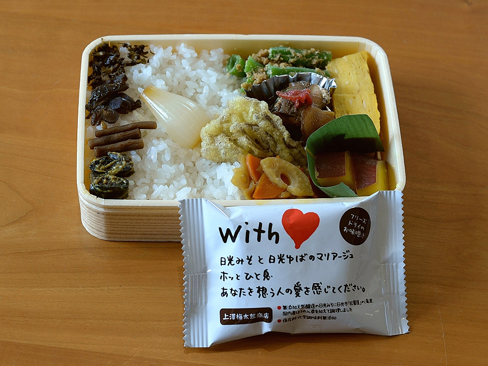 撮影の機材を片付けたところで冷蔵庫からいそいそと長葱を取り出す。上澤梅太郎商店の即席味噌汁は、勿論、お湯を差すだけで美味い。しかし薬味を加えれば、更に美味くなる。そうして撮影したばかりの弁当を昼食とする。