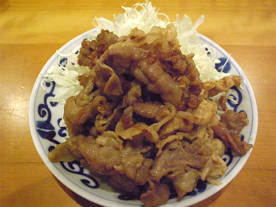 晩飯 めかぶの酢の物、「夏太郎」らっきょう、ポテトサラダ、枝豆、刻みキャベツを添えた豚の生姜焼き、メシ、サッポロ焼酎(生にTIO PEPEを少々)