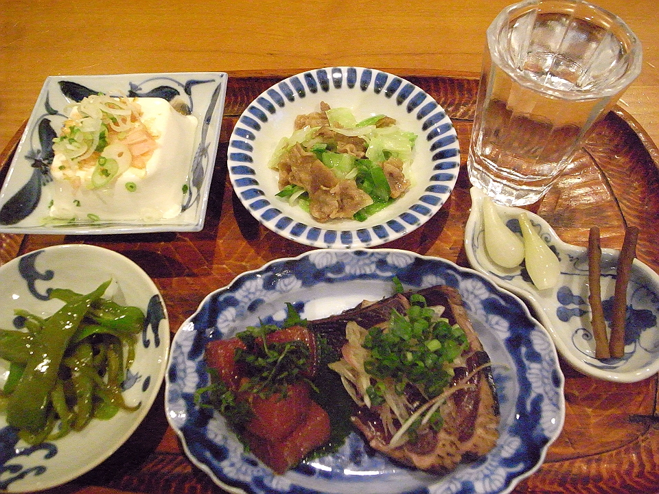 晩飯 ピーマンのソテー、冷や奴、豚肉とキャベツのソテー、鮪の「日光味噌のたまり浅漬けの素・朝露」漬け、鰹のたたき、「夏太郎」らっきょう、ごぼうのたまり漬、胡麻焼酎「紅乙女」(生)
