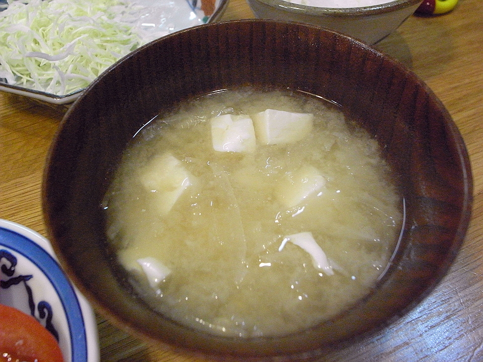朝飯 揚げ湯波と小松菜の炊き合わせ、炒り豆腐、冷や奴、トマトサラダ、らっきょうのたまり漬「小つぶちゃん」、ごぼうのたまり漬、メシ、長芋と若布の味噌汁