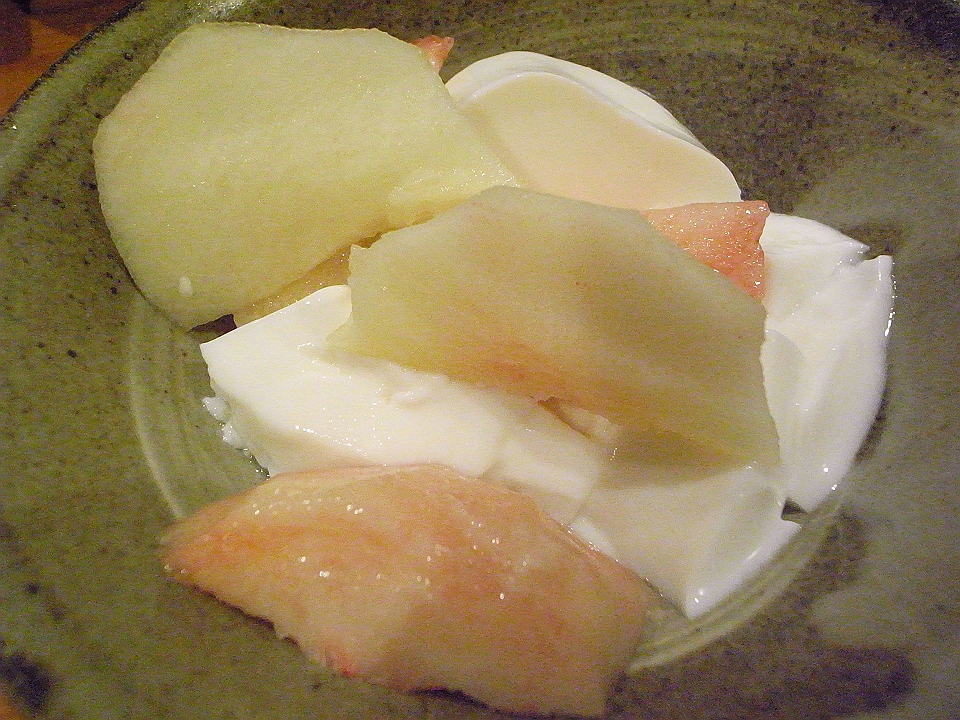 晩飯 小松菜のおひたし、めかぶの酢の物、冷や奴、山葵漬けを添えた蒲鉾、茄子の塩漬け、赤魚の粕漬け、サッポロ焼酎(生にTIO PEPEを少々)、梨