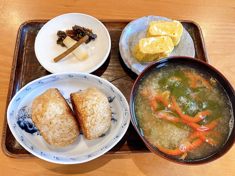朝飯 焼きおむすび、玉子焼き、たまり漬「七種きざみあわせ・だんらん」、ごぼうのたまり漬、らっきょうのたまり漬「小つぶちゃん」、若布とパプリカの味噌汁