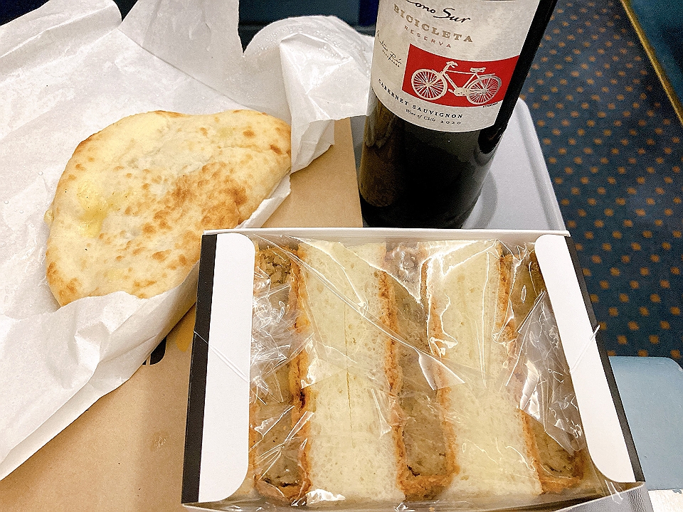 晩飯 新石垣空港で買ったコロッケサンド、「ドトールコーヒー」のカルツォーネ、Cono Sur Cabernet Sauvignon Bicicleta Reserva 2020