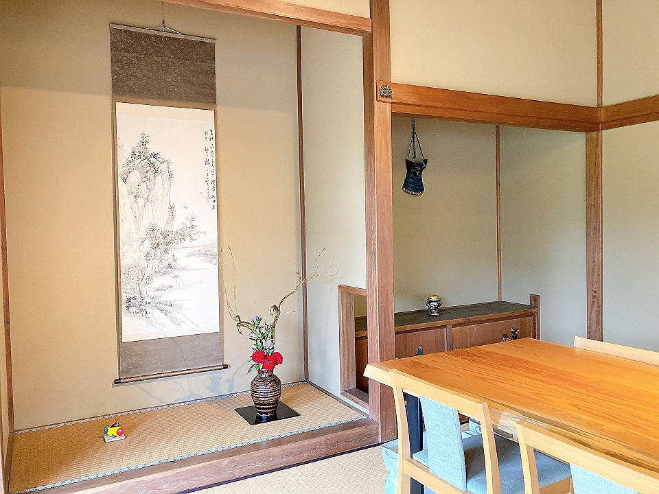 第2班のお客様を駐車場でお見送りした直後に家内から電話が入る。庭に面した6畳間に運んだ6名用テーブルを、奥の個室「杉の間」へ戻す手伝いをして欲しいという。それを済ませて店に戻ろうとする途中、どうやら隠居へ向かわれると思われる4名様が目についた。お声がけをすると果たして、ひと月ほど前からご予約をいただいていたリピータ様でいらした。