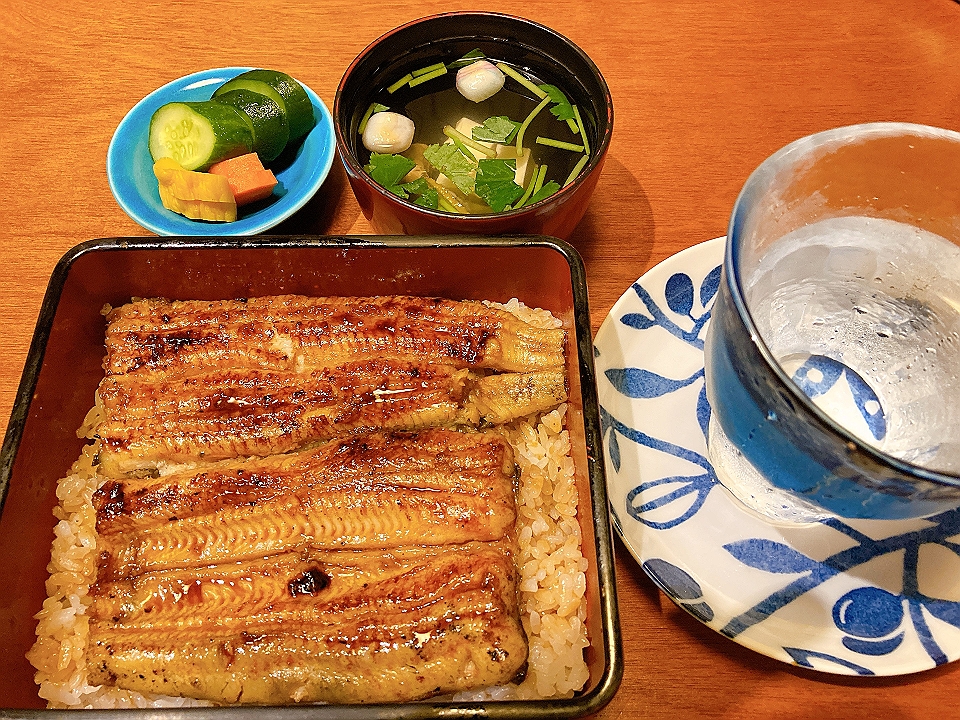 晩飯 「魚登久」の胆焼き、鰻重、片山酒造の酒粕焼酎「粕華」(生)