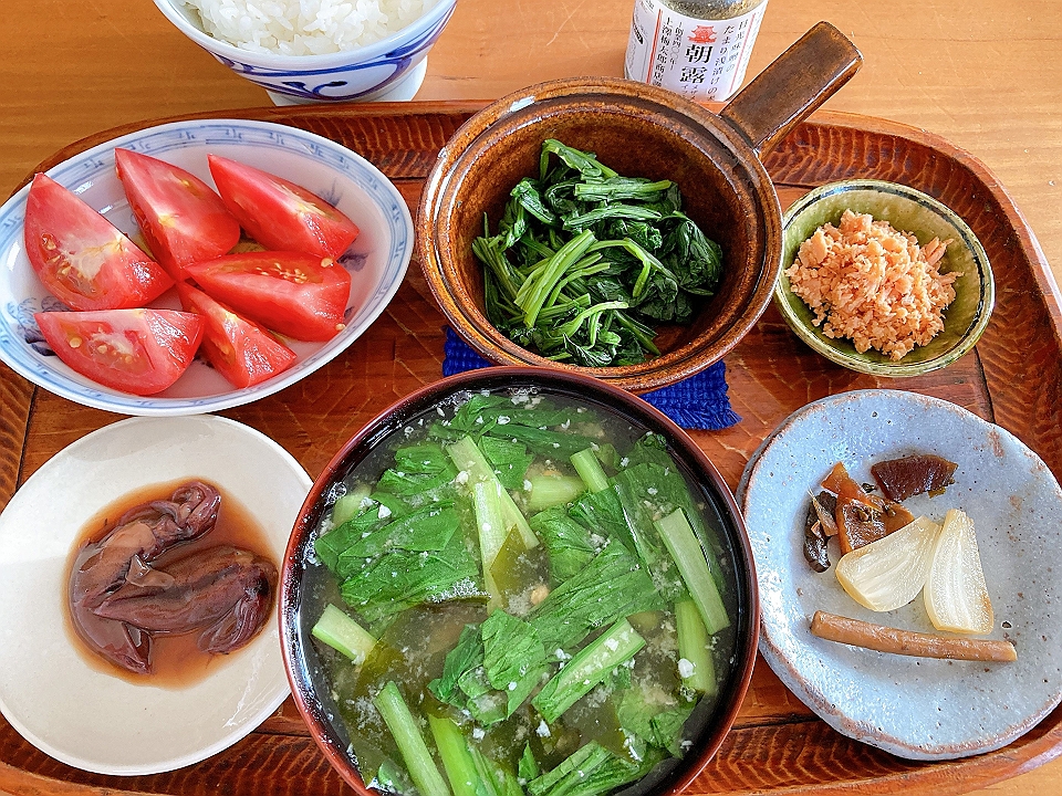 朝飯 トマトサラダ、菠薐草の油蒸し、ほぐし塩鮭、蛍烏賊の沖漬け、たまり漬「七種きざみあわせ・だんらん」、らっきょうのたまり漬、ごぼうのたまり漬、メシ、若布と小松菜の味噌汁