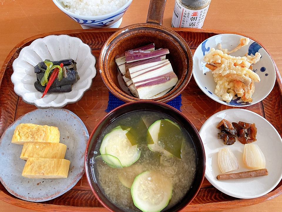 朝飯 玉子焼き、茄子とピーマンとパプリカの味噌炒り、茄子の油蒸し、人参の天ぷら、たまり漬「七種きざみあわせ・だんらん」、らっきょうのたまり漬、ごぼうのたまり漬、メシ、若布とズッキーニの味噌汁