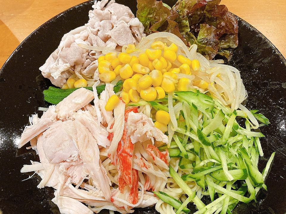 晩飯 夏太郎らっきょう、ごぼうのたまり漬、焼き餃子、「珍来軒」の呉冷麺、麦焼酎「こいむぎやわらか」(生)