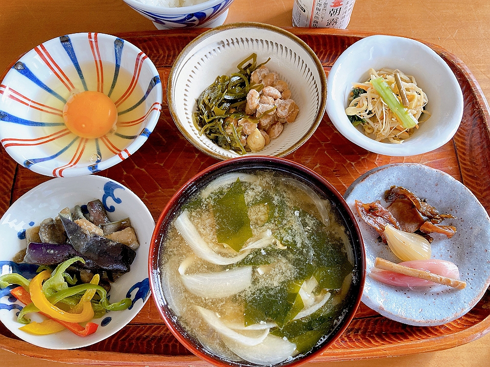朝飯 夏野菜の油炒めと味噌炒り、生玉子、炒り昆布を薬味にした納豆、五目野菜のナムル風、茗荷の酢漬け、たまり漬「七種きざみあわせ・だんらん」、らっきょうのたまり漬、ごぼうのたまり漬、メシ、若布と玉葱の味噌汁