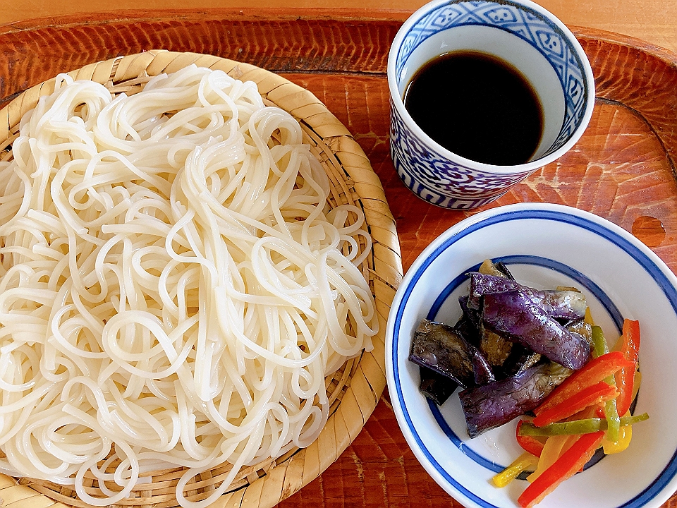 昼飯 茄子の揚げびたしとパプリカのソテーを添えたざる素麺