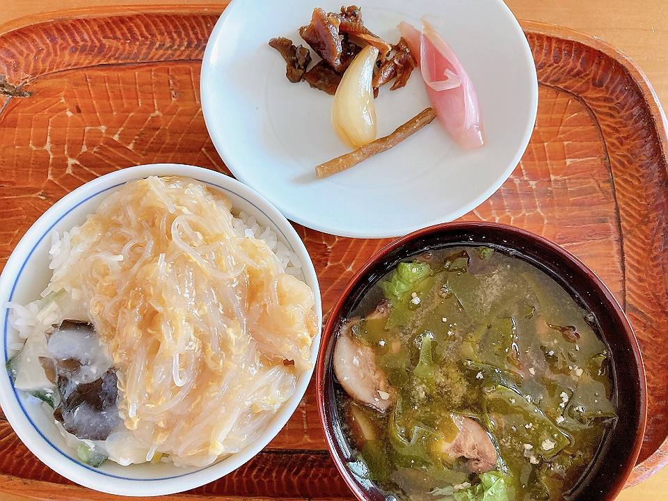 朝飯 きのうの夜のおかずのぶっかけめし、若布とレタスと椎茸の味噌汁、たまり漬「七種きざみあわせ・だんらん」、らっきょうのたまり漬、ごぼうのたまり漬