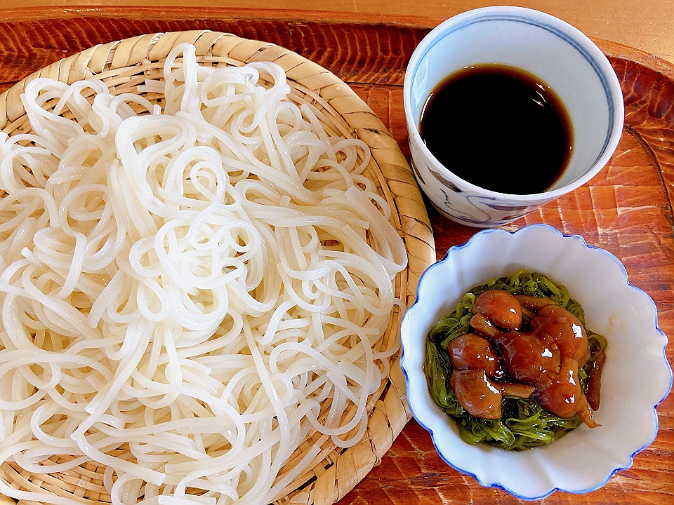 昼飯 めかぶと「なめこのたまり炊」を添えたざる素麺