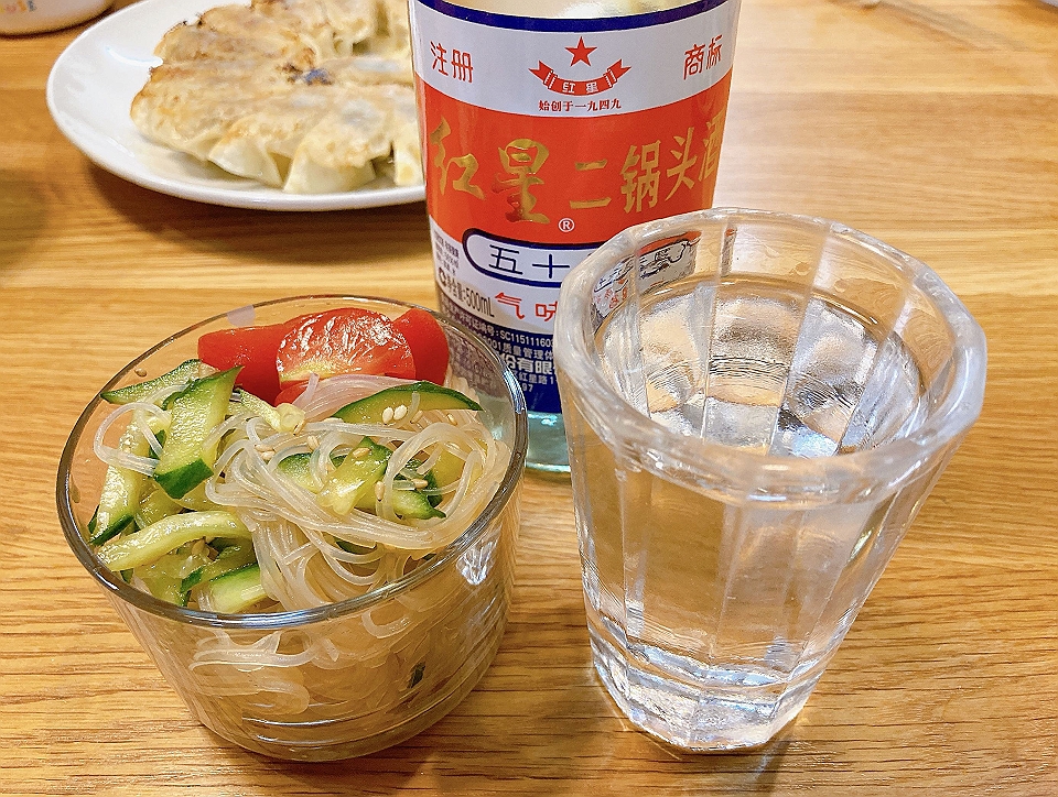 晩飯 大根の味噌汁、春雨サラダ、焼き餃子、「紅星」の「二頭鍋酒」(生)
