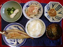 朝飯は、キュウリとカブのぬか漬け、冷や奴、納豆、カマスの干物、メシ、お麩とワカメと長ネギの味噌汁。