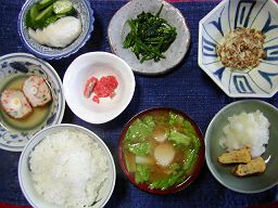 朝飯は、五目カマボコの炊きもの、キュウリとカブのぬか漬け、塩鮭、ホウレンソウの油炒め、納豆、卵焼きと大根おろし、メシ、サトイモとユキナの味噌汁。