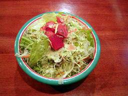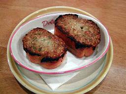 緑のサラダ、ミラノ風のジャガイモ、オリーヴオイルがこってり浸みた ニンニクパン。