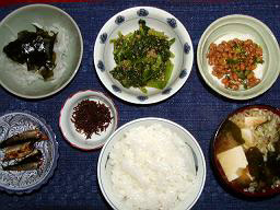 朝飯は、広島菜、ミツバのおひたし、納豆、ジャコ、メシ、豆腐と桜エビと長ネギの味噌汁。