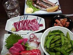 ボタンエビ、マグロ、水ダコの刺身、馬刺し、ししゃもの焼いたの、エダマメなどが、目に鮮やかだ。焼酎のお湯割りを飲みつつユリネのタラの子和えを食べる。「正月のおせちは高コレステロールのものばかりと聞いたが、酒の肴もそれに劣らねぇわなぁ」 と今さらのように考えながら、自分の前の皿をきれいにしていく。