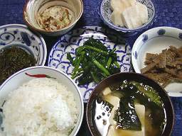 朝飯は、海苔、生わさび、カブとキュウリのぬか漬け、メシ、鴨と長ネギの味噌汁。