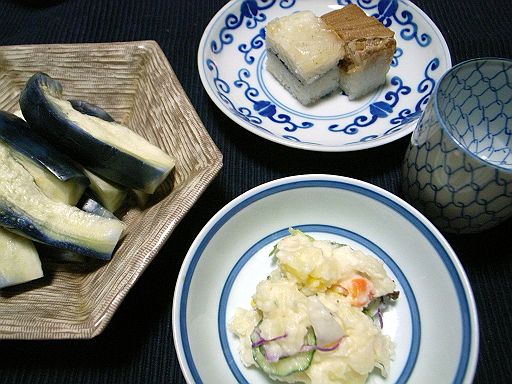 そして夜は、水茄子のぬか漬、大阪の小さな押し寿司、ポテトサラダなどにて泡盛 「玉友」 のお湯割りを飲む。