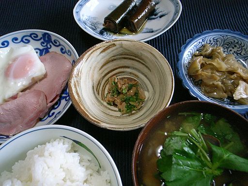 朝飯はハムエッグ、鯖の昆布巻き、米麹を混ぜ込んだ納豆、ザーサイ、メシ、シジミと三つ葉の味噌汁。