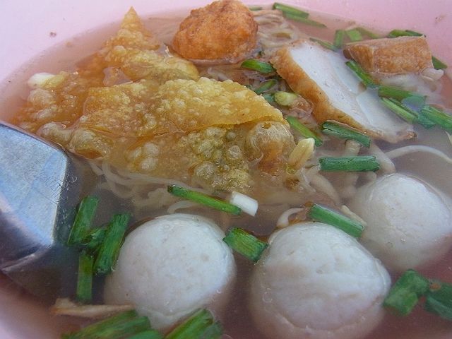 フアランポーン駅構内のクイティオ屋が美味いと聞いていたため出かけてみると、米粉による太麺細麺は残っていたが、小麦粉によるバミーは売り切れていた。よって駅前にいくつか並ぶ食堂から1軒を選び、路上のテーブルでバミーナムを食べる。
