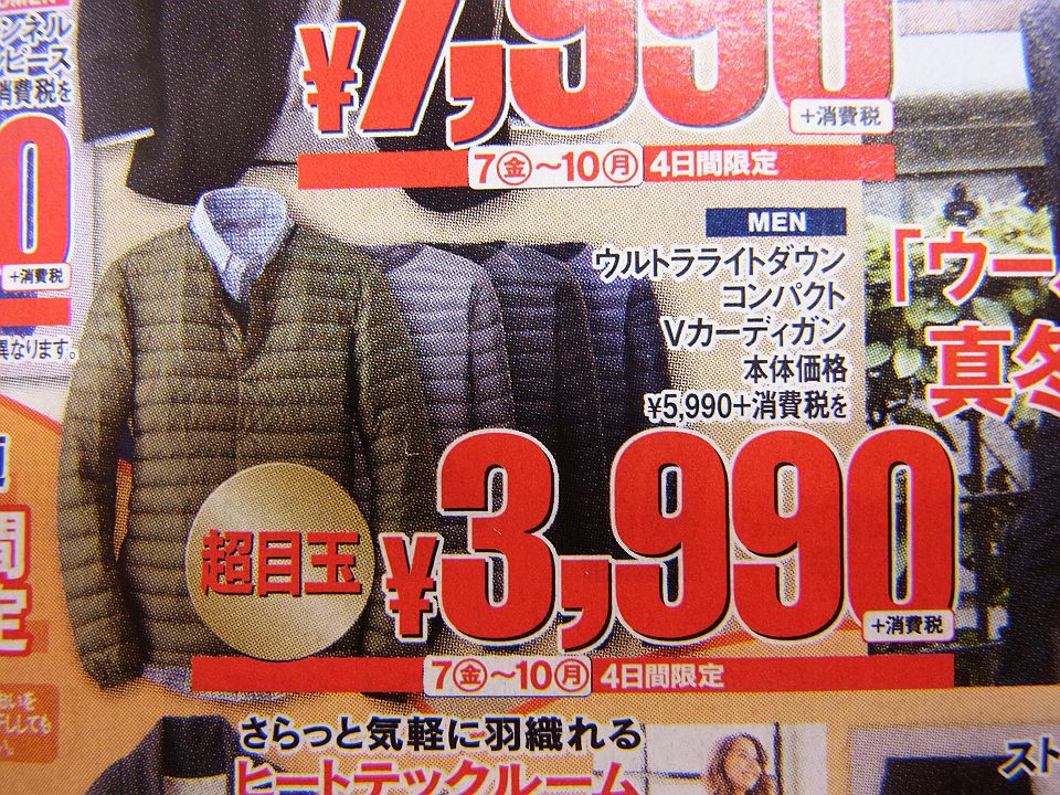 あれこれ考え"UNIQLO"の「ウルトラライトダウンコンパクトVカーディガン」を欲しいと感じた。奇しくも今朝の新聞には、その安売りを伝えるチラシも入った。そうして午後、銀行へ行くついでに"UNIQLO"の日光店に寄った。そこで目的の品を試着し、脱いでハンガーに戻し、しばし考えた。