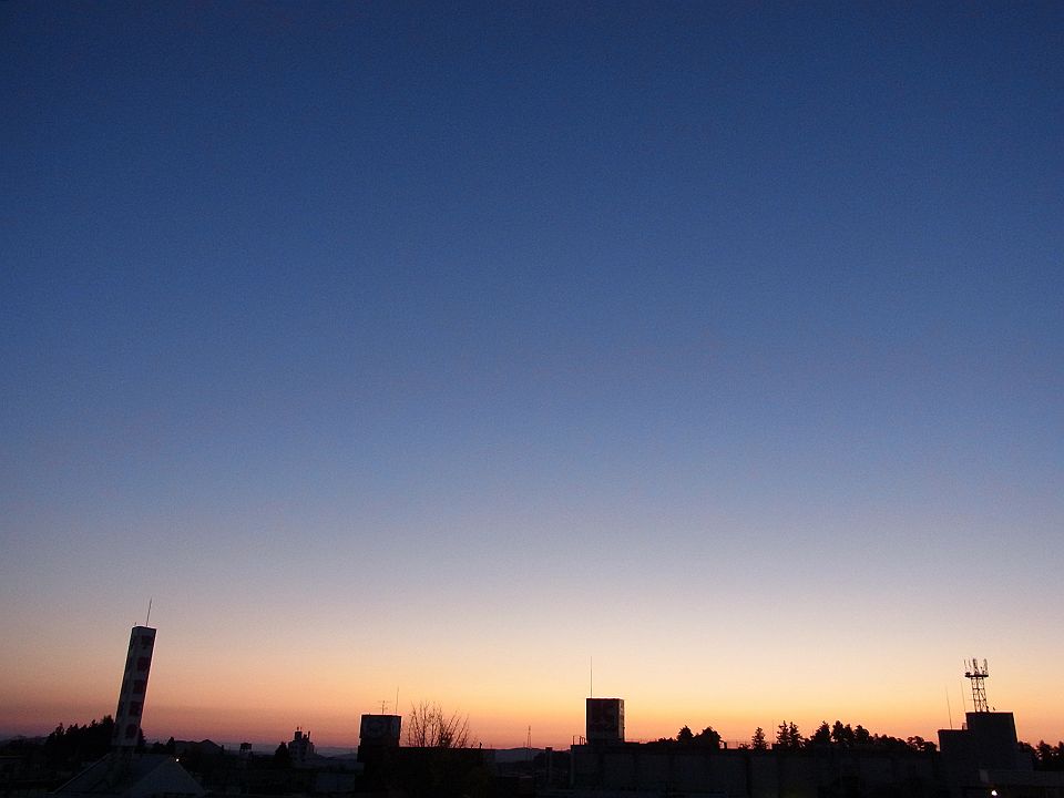 明けつつある紅い空を背にして見えるのは、左から証券会社の看板、角丸酒店のキリンビールの看板、スーパーマーケット「かましん」の看板、そして"NTT"のアンテナである。以前の眺めとそれほど変わらないのは、タワー式の駐車場の代わりに「かましん」の看板が見えるようになったからかも知れない。