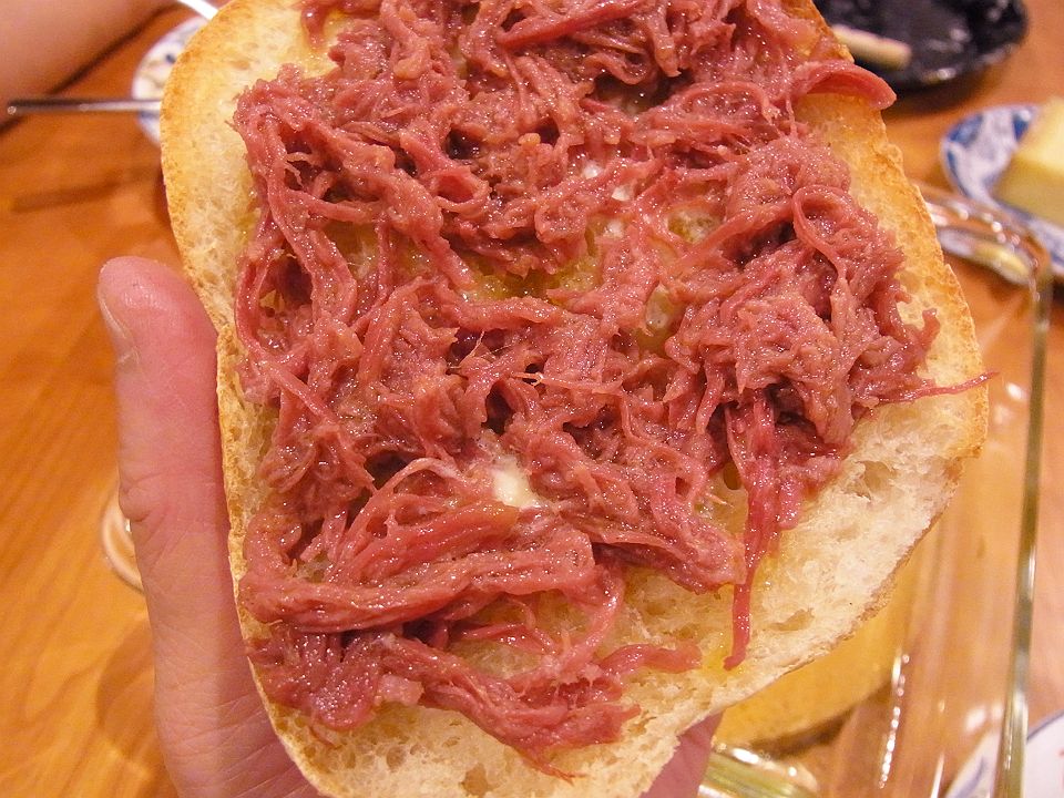 夜はそのパンを焼いてバターを塗り、そこに"neu frank"の、熱を加えて柔らかくしたコンビーフを広げる。それを左手に持ち、右手には赤ワインを満たしたグラスを持つ。溶けたバターがパンから左手にしたたり落ちる。右手は右手で忙しい。