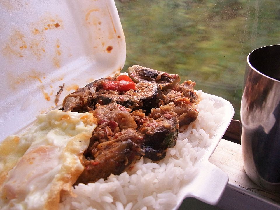 大きな街が現れたと思っていたら、そこが"RATCHABURI"だった。時刻は16時50分。定刻は15:52だから、既にして1時間25分も遅れている。ここで17時になるのを待って、ファランポーン正面から入って中ほど右側のクーポン食堂で詰めさせた2つの弁当のうちの、先ずはカオカームーを取り出す。そしてそれを肴に日本から持参した麦焼酎を生で飲む。