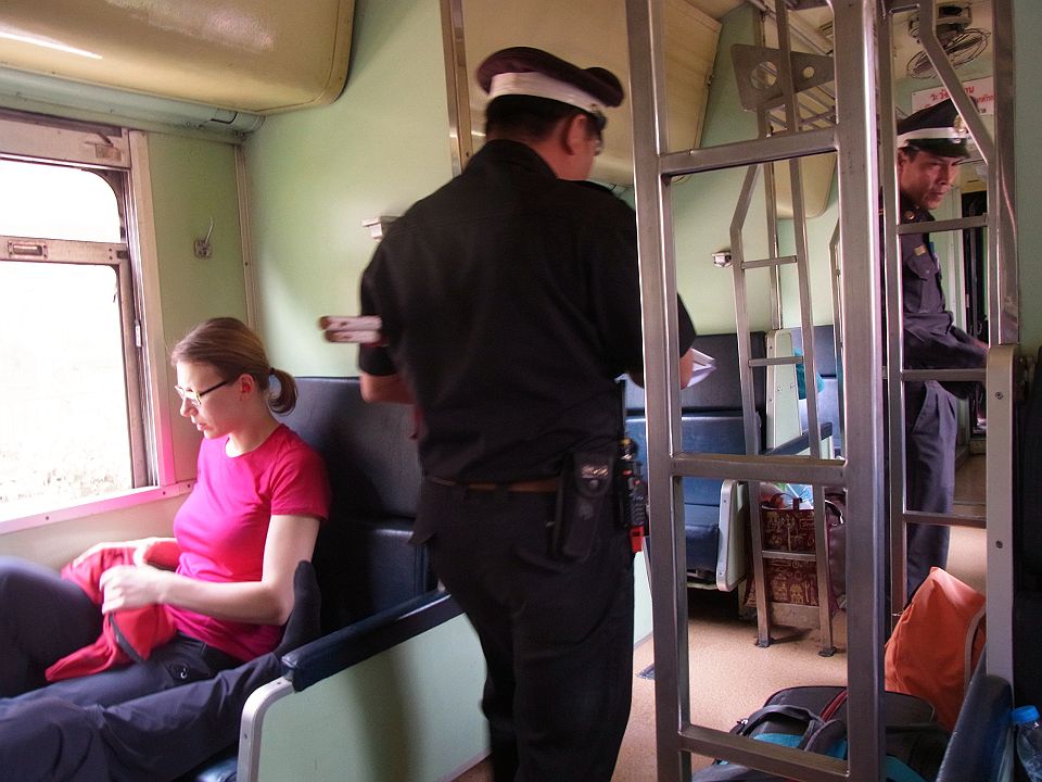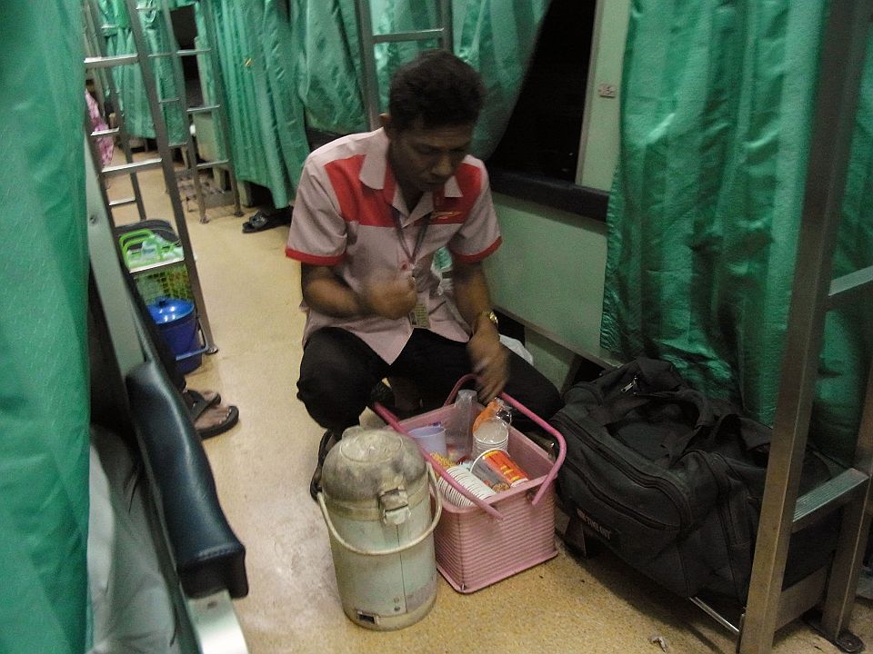 タイの二等寝台車は寝台が進行方向と平行して、車両の両側に縦に並ぶ。夜は下段の寝台になる場所に、昼はひとり用の座席が向かい合う。下段の旅客は進行方向に向き、上段の旅客は進行方向に背を向けて座る。座席の幅は70センチほどもあって、とても楽だ。僕の向かい側には白人のオジサンが来た。挨拶をしたけれど、相手はヘッドフォンを着けているため、反応は薄い。