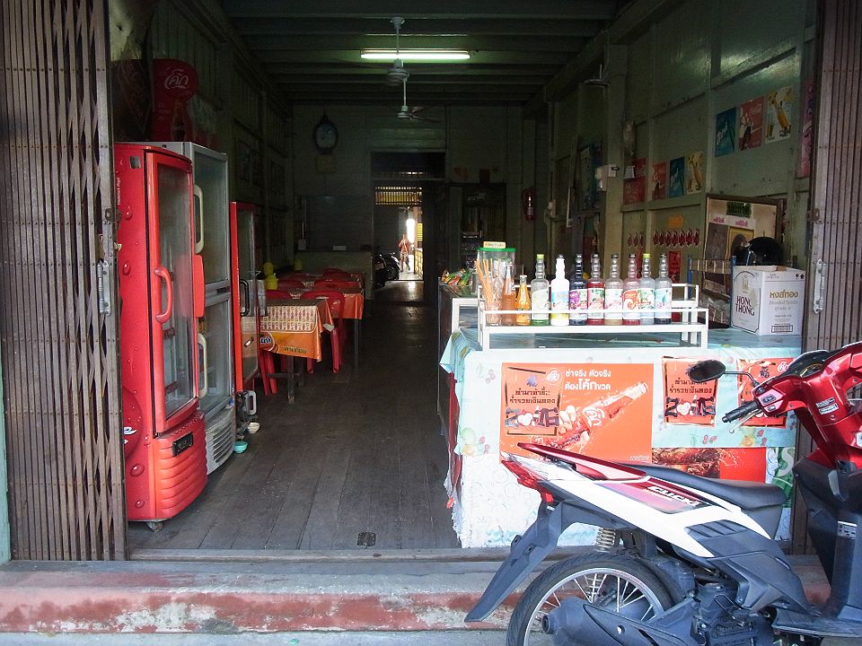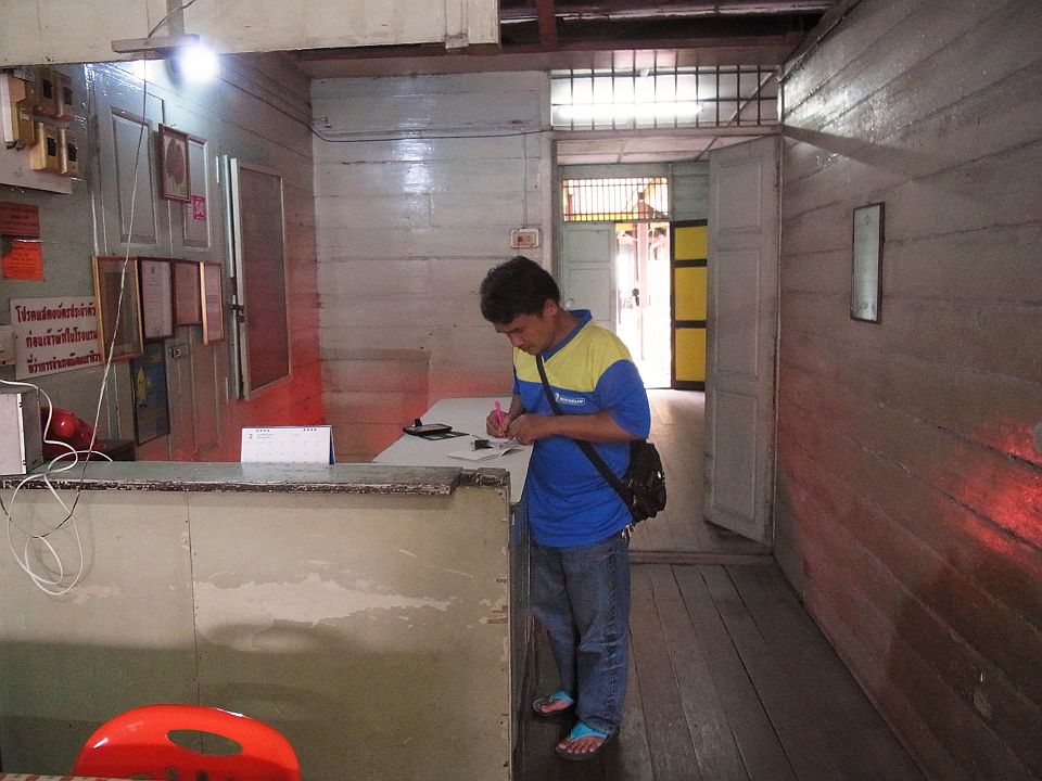 右にジュース用のシロップやスナック菓子、左に飲み物用の冷蔵庫を置いた入口から、4人用のテーブルが5つ6つ置かれた薄暗い板の間を進むと、右奥の事務室からオニーチャンがにこやかに出てきた。泊まりたい旨を伝えると「パスポート」とひとこと、オニーチャンは言った。オニーチャンは英語はほぼまったく話せず、片手の指を5本、もう片方の手の指を4本立てて「ナイン」と、3泊分の宿泊料を告げた。僕は1,000バーツ札1枚を差し出し、100バーツ1枚を受け取る。