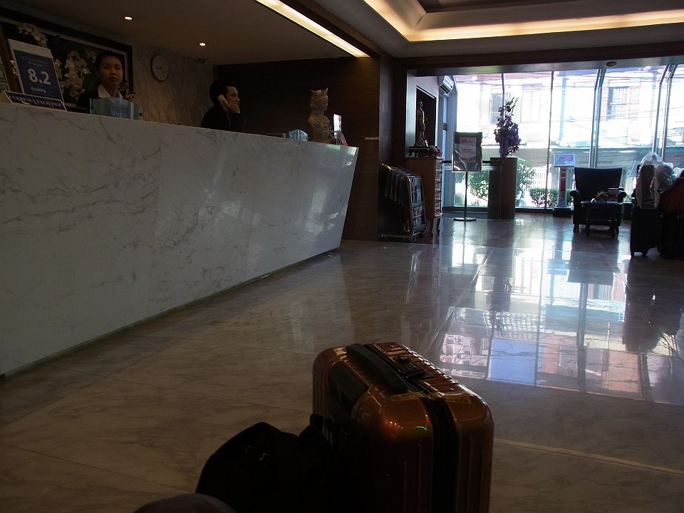 来るときには8キロほどで軽快だったスーツケースも、今や、きのうロビンソン百貨店で買った土産を孕んで大層、重くなっている。それを曳き、ザックを背負い、ロビーに降りてハガキ12通に対して180バーツの切手代をフロントに払う。そしてまた、チェックアウトもする。