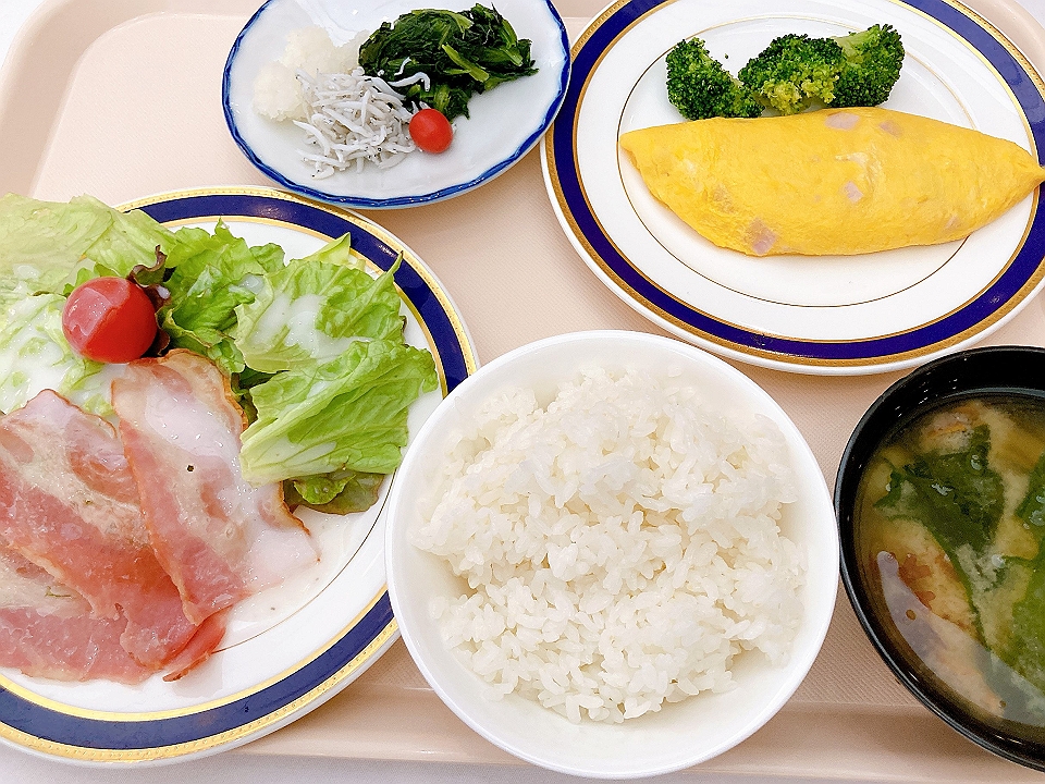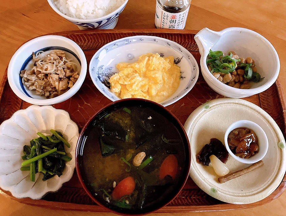 朝飯 ウインナーソーセージのソテーを添えたスクランブルドエッグ、トマトとレタスのサラダ、納豆、なめこのたまり炊、たまり漬「七種きざみあわせ・だんらん」、らっきょうのたまり漬「小つぶちゃん」、ごぼうのたまり漬、メシ、白菜と若布の味噌汁