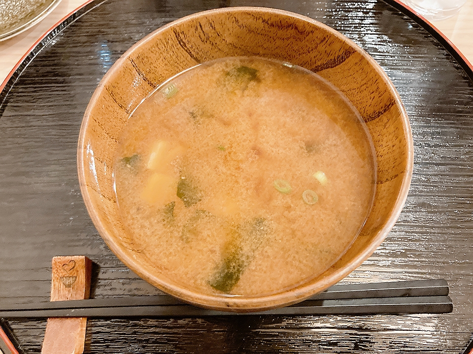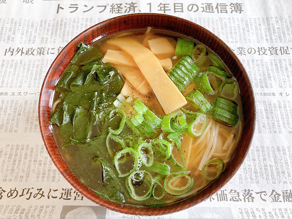 昼飯 「みそめぼれ」の塩おむすび、豆腐と若布と万能葱の味噌汁