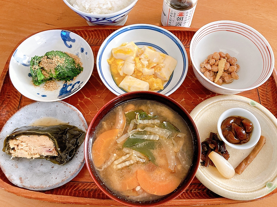 朝飯 春菊のおひたし、豆腐の玉子とじ、納豆、鮭の昆布巻、なめこのたまり炊、たまり漬「七種きざみあわせ・だんらん」、らっきょうのたまり漬「小つぶちゃん」、ごぼうのたまり漬、メシ、白菜と人参と若布の味噌汁