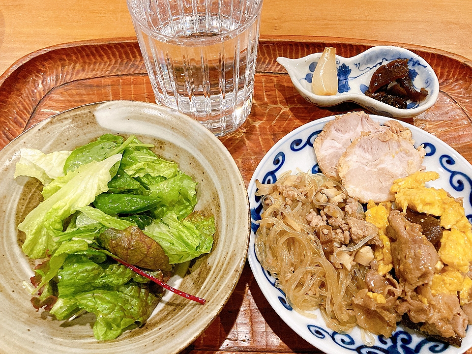 晩飯 レタスのサラダ、木須肉、春雨と豚挽き肉の中華風炒め、チャーシュー、チャーハン、らっきょうのたまり漬「小つぶちゃん」、たまり漬「七種きざみあわせ・だんらん」、麦焼酎「むぎっちょ」(お湯割り)