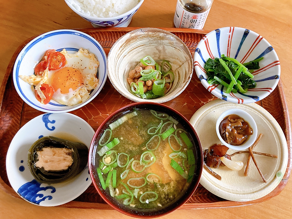 朝飯 トマトのソテーを添えた目玉焼き、納豆、菠薐草のソテー、鮭の昆布巻、なめこのたまり炊、たまり漬「七種きざみあわせ・だんらん」、らっきょうのたまり漬「小つぶちゃん」、ごぼうのたまり漬、メシ、豆腐と若布と長葱の味噌汁