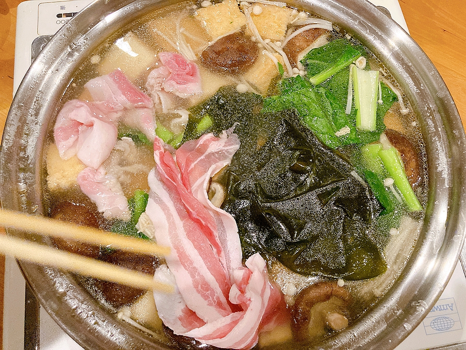 晩飯 豚肉と厚揚げ豆腐とキノコと小松菜と若布の鍋、らっきょうのたまり漬「小つぶちゃん」、なめこのたまり炊、麦焼酎「むぎっちょ」(お湯割り)、プリン、Old Parr(生)