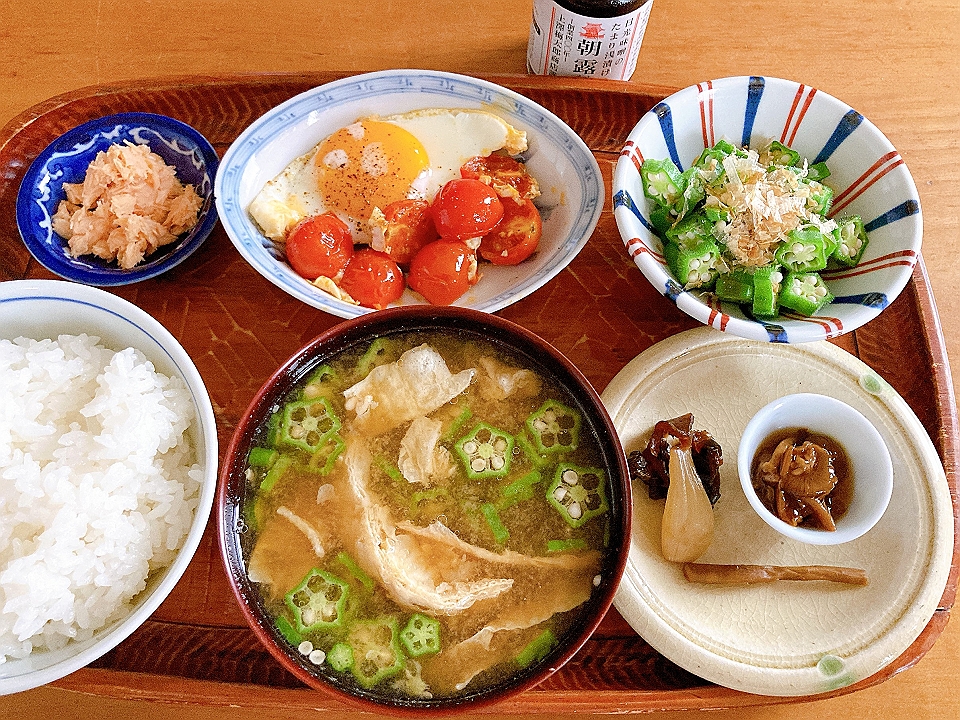 朝飯 鮭の焼きほぐし、トマトのソテーを添えた目玉焼き、刻みオクラの鰹節かけ、なめこのたまり炊、たまり漬「七種きざみあわせ・だんらん」、らっきょうのたまり漬「小つぶちゃん」、ごぼうのたまり漬、メシ、揚げ湯波とオクラの味噌汁