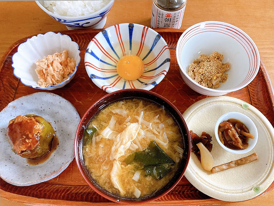 朝飯 鮭の焼きほぐし、生玉子、納豆、ピーマンの肉詰め、なめこのたまり炊、たまり漬「七種きざみあわせ・だんらん」、らっきょうのたまり漬「小つぶちゃん」、ごぼうのたまり漬、メシ、キャベツと若布と揚げ湯波の味噌汁