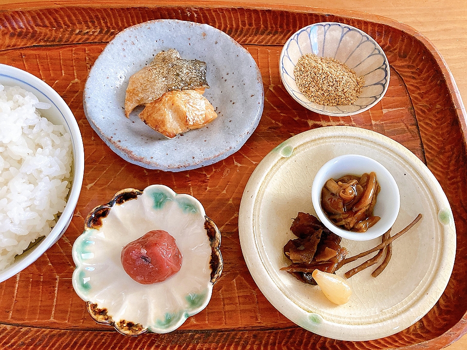 朝飯 焼き鮭、擂り胡麻、梅干、なめこのたまり炊、たまり漬「七種きざみあわせ・だんらん」、らっきょうのたまり漬「小つぶちゃん」、ごぼうのたまり漬のお茶漬け