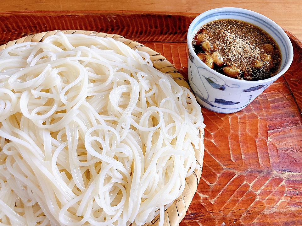 昼飯 納豆と擂り胡麻のつゆで食べる素麺