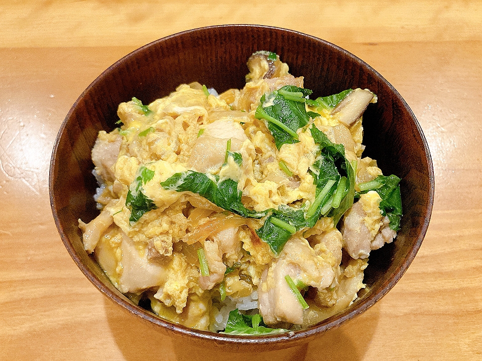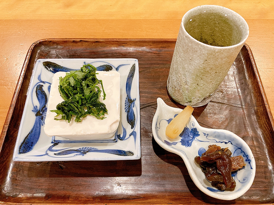 晩飯 冷や奴、らっきょうのたまり漬「小つぶちゃん」、たまり漬「七種きざみあわせ・だんらん」、親子丼、「山本合名」の山廃純米「天杉」(冷や)